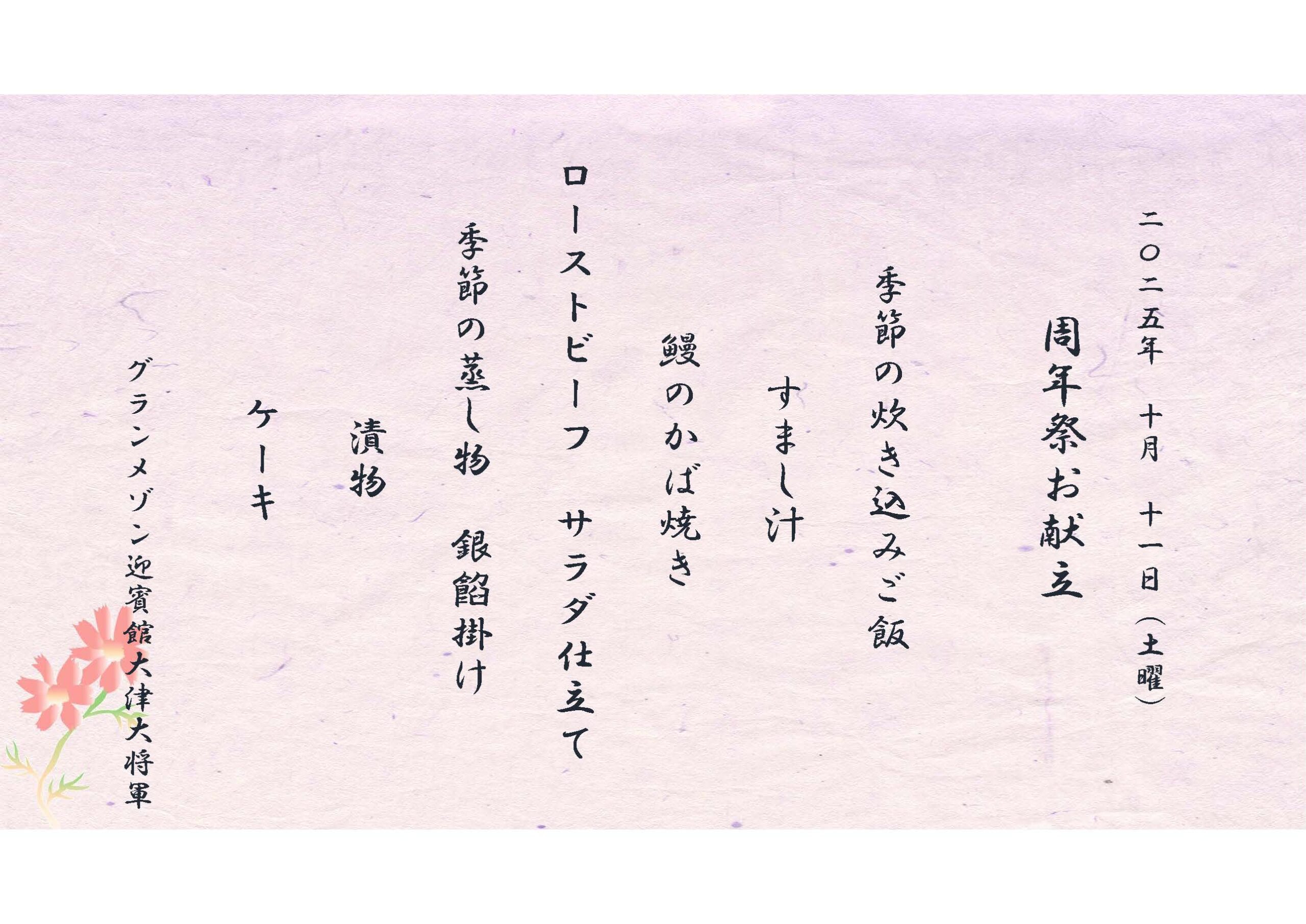 10月11日(土)は、 グランメゾン迎賓館大津大将軍にて、周年祭のイベント食を提供致しました✨ 周年のお祝いということで、和食の特別献立です。 どれから食べようか悩んじゃいますね😋 皆さま!いつも有難うございます! そして、これからもどうぞよろしくお願いいたします🎉✨