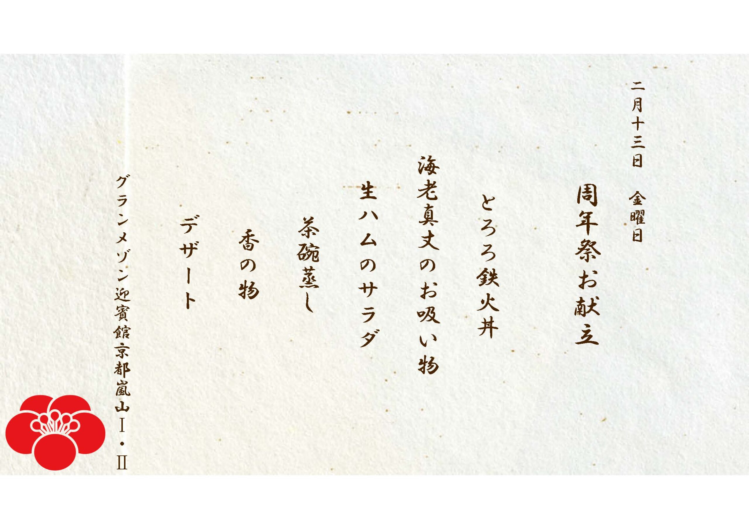 2月13日(金)は、 グランメゾン迎賓館 京都嵐山Ⅰ・Ⅱにて、周年祭のイベント食を提供致しました✨